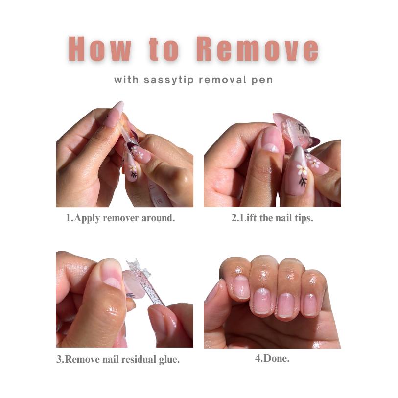 • Gentle and Pain-Free: Enables gentle, quick, and painless removal of SASSYTIP press-on nails, press on nail glue remover avoiding harm to natural nails and replacing traditional removers with their toxic odors and damaging solvents.