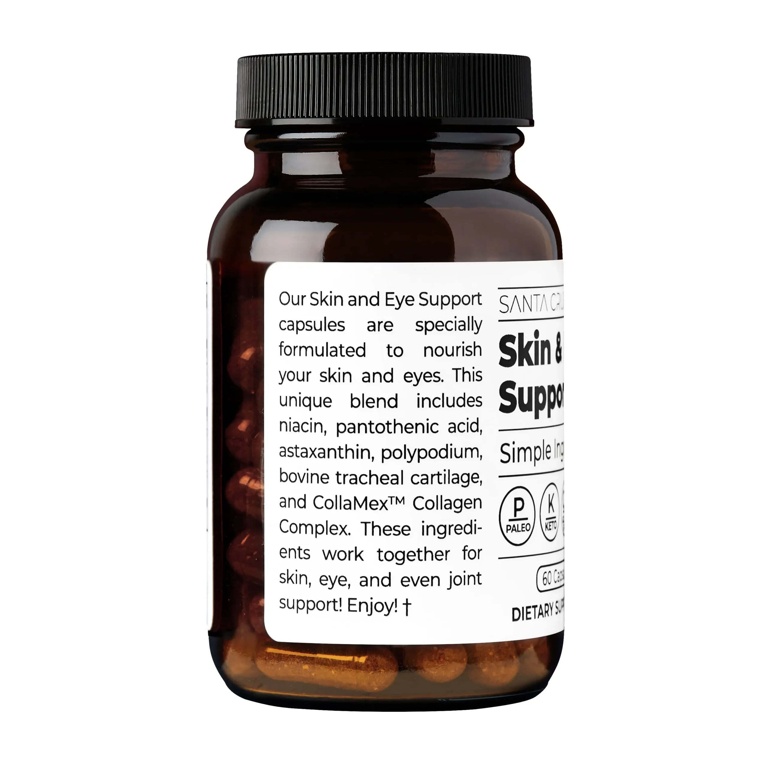 Our Skin and Eye Support capsules are specially formulated to nourish your skin and eyes. This unique blend includes niacin, pantothenic acid, astaxanthin, polypodium, bovine tracheal cartilage, and colamex collagen complex. These ingredients work together for skin, eye and even joint support! Enjoy!