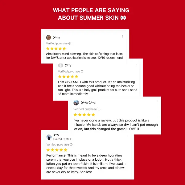 Step 2: next nourish, repair, hydrate. Summer Skin is an ultra lightweight, deeply hydrating body lotion that will hydrate, soften and repair dry skin. Unlike traditional body lotions, Summer Skin glides on, absorbs fast and leaves no sticky, greasy residue.