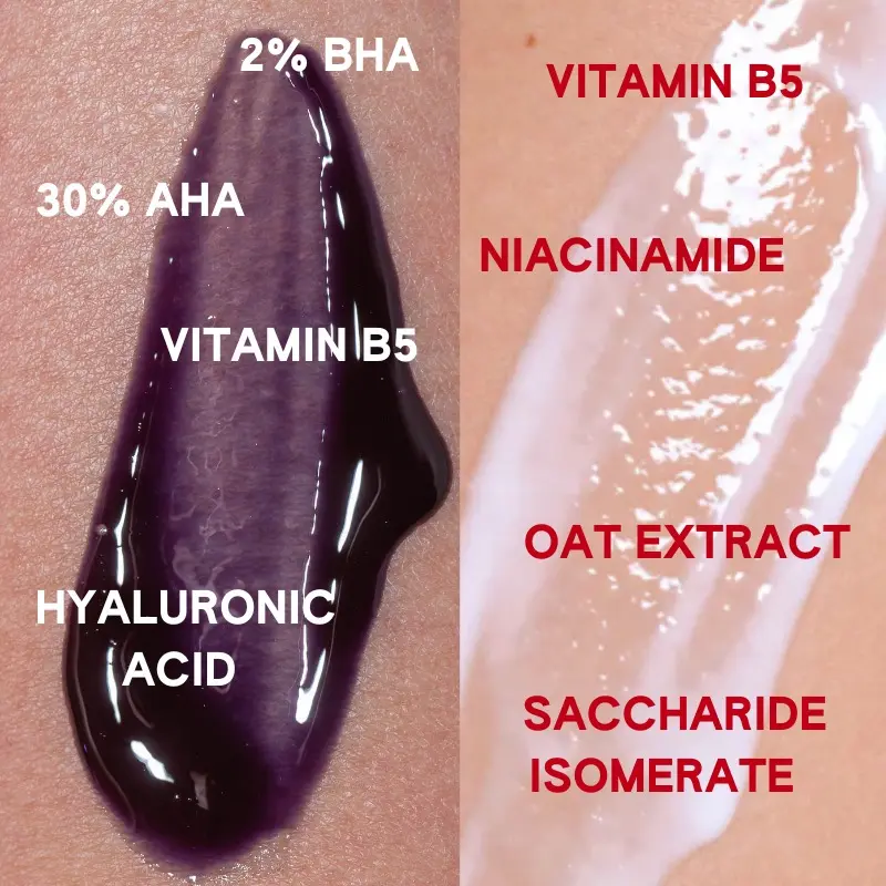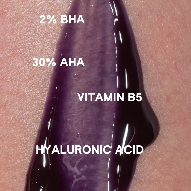 Powered by four active ingredients: Glycolic Acid 30% | Salicylic Acid 2% | Vitamin B5 | Hyaluronic Acid