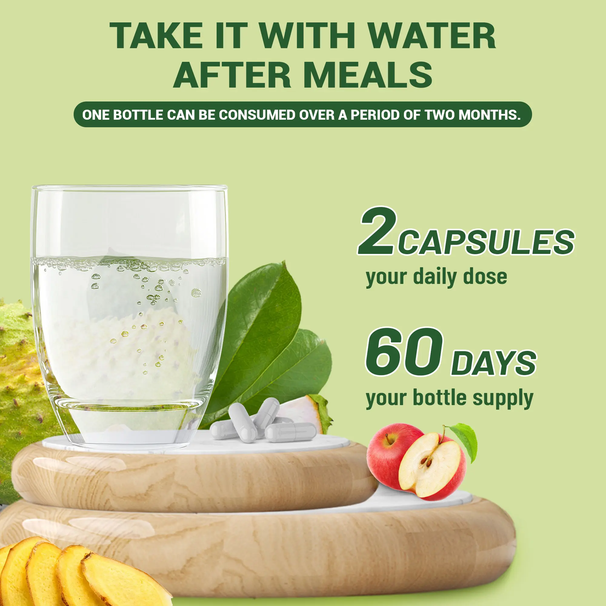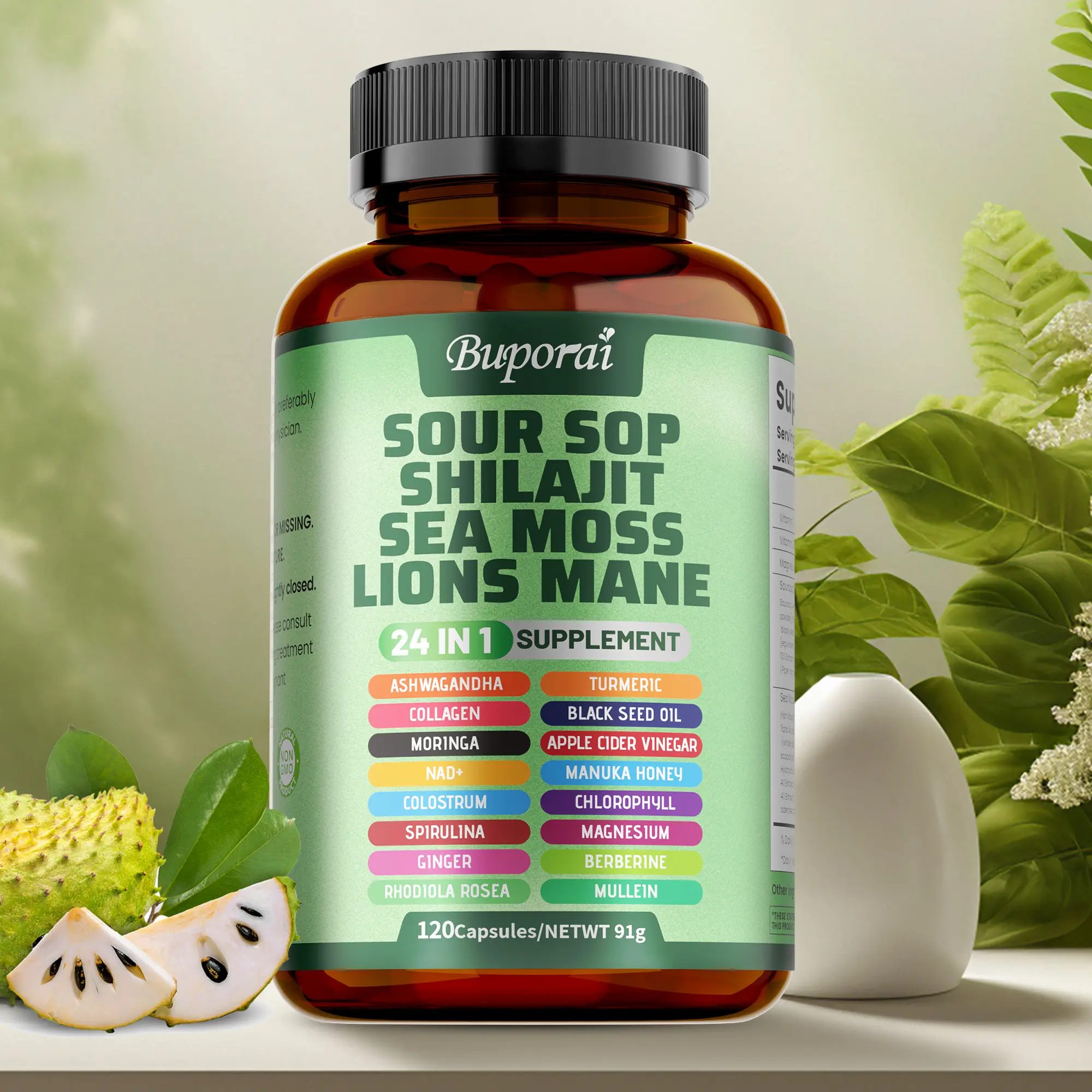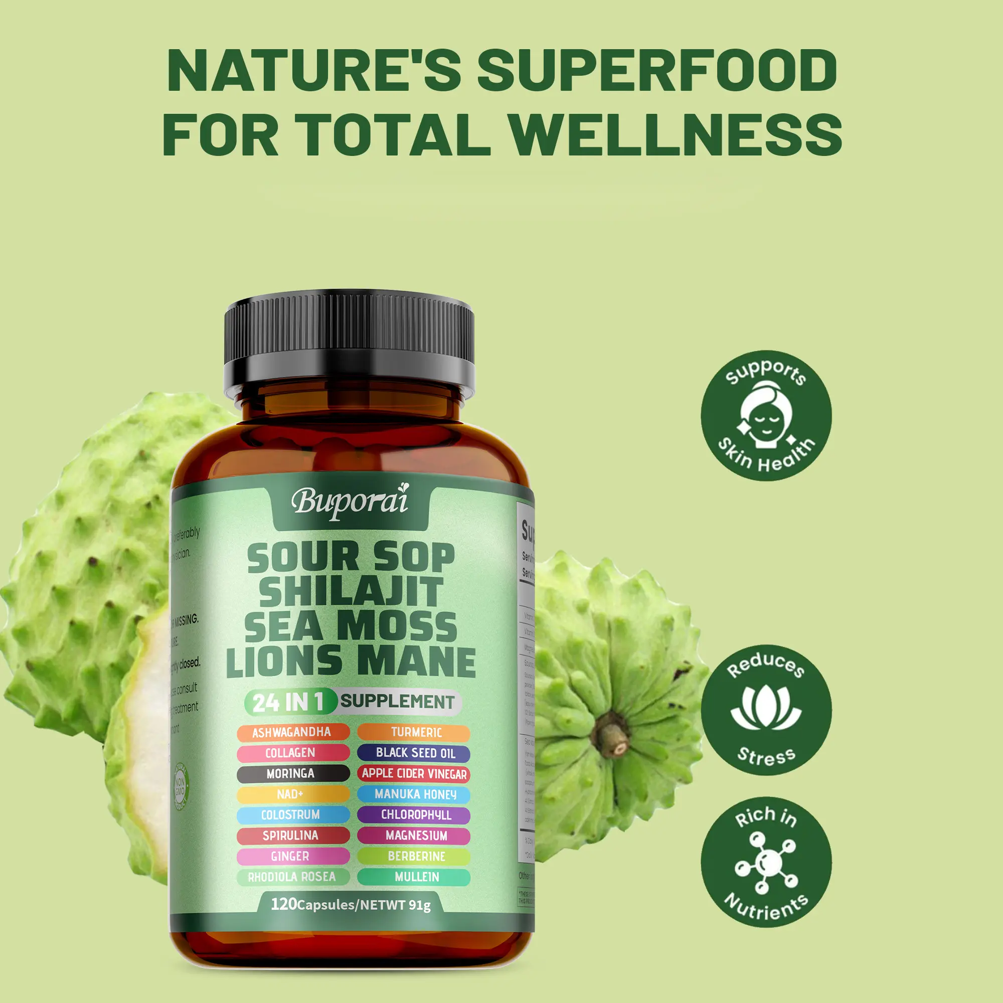 Discover the Soursop Dietary Supplement, rich in antioxidants. Each bottle contains 120 capsules, offering a comprehensive blend. This supplement includes added shiitake mushroom, seaweed, and lion’s mane mushroom. Perfect for those seeking support in skin, joint, and bone health.