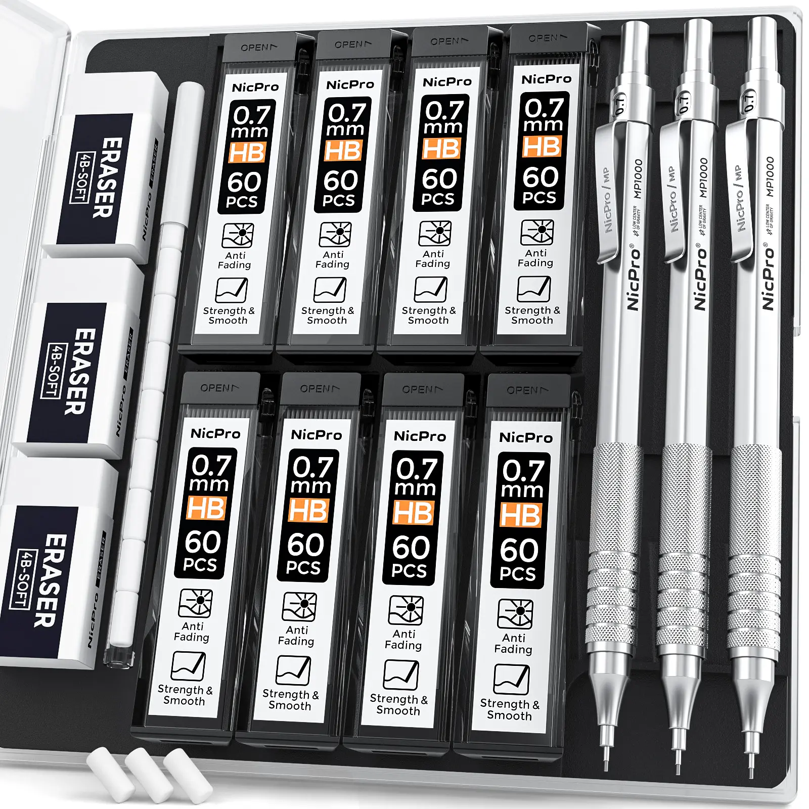 Nicpro 0.7 Metal Mechanical Pencil Set with Case, 3Pack MP1000 0.7mm Artist Lead Pencil With 8 Tube HB Refills, 3
