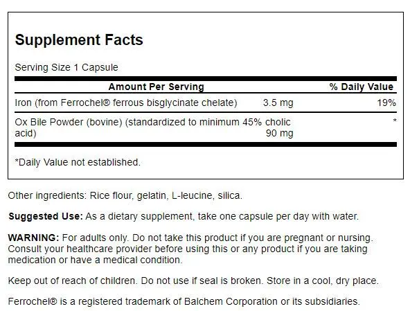 - Ingredients: Iron 3.5 mg 19%,Ox Bile Powder (bovine) 90 mg *,Other ingredients: Rice flour, gelatin, silica, L-leucine.,As a dietary supplement, take one capsule per day with water.,Do not take this product if you are pregnant or nursing. Consult your healthcare provider before use if you are taking any prescription medications.