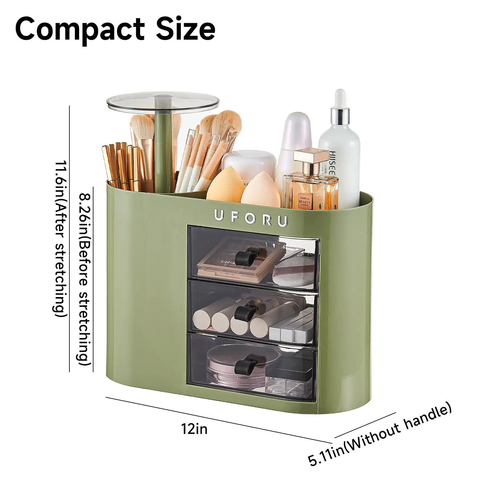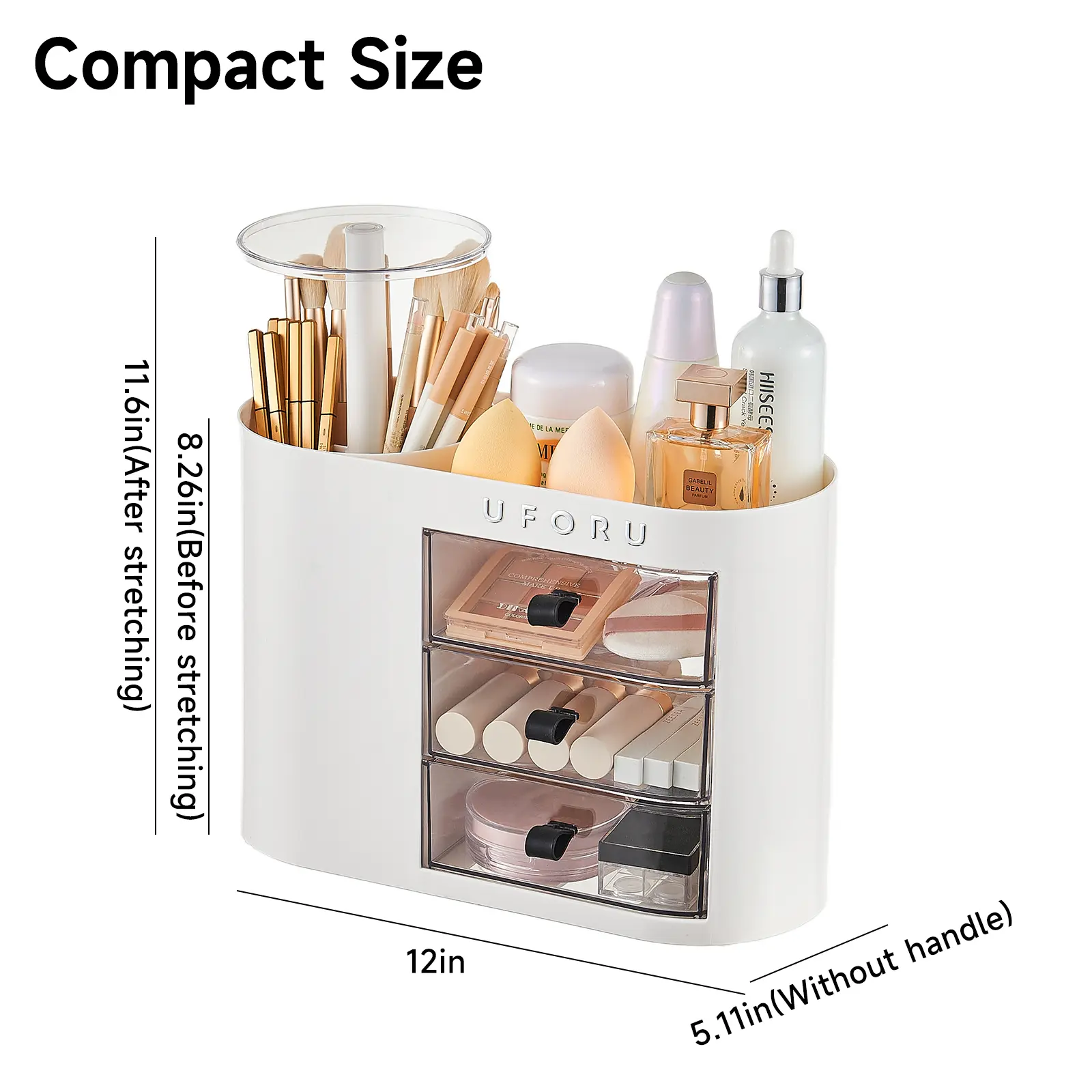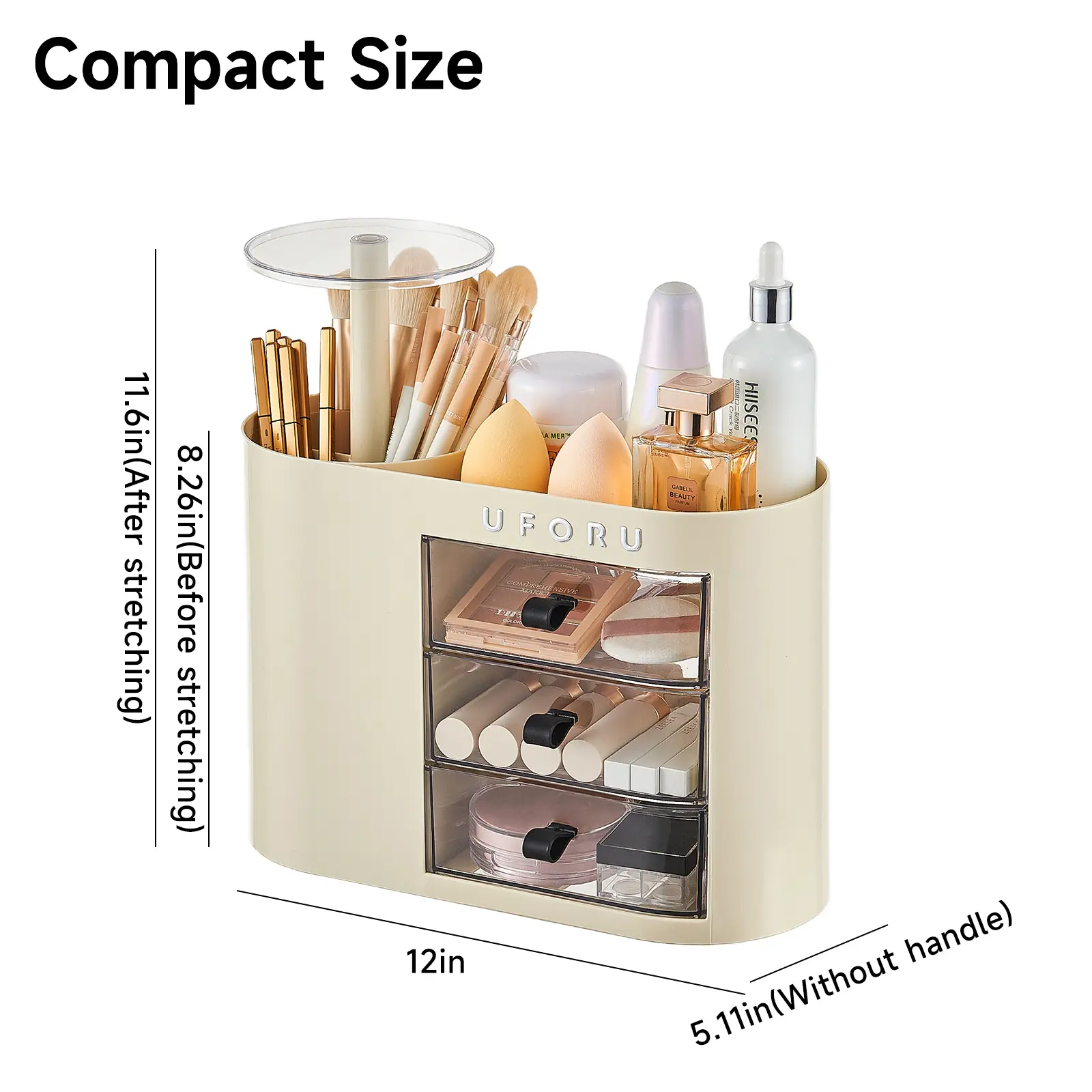 The UFORU Makeup Organizer with its signature one-touch expandable brush holder and spacious drawers turns any vanity or bathroom countertop into a sleek, organized beauty station.